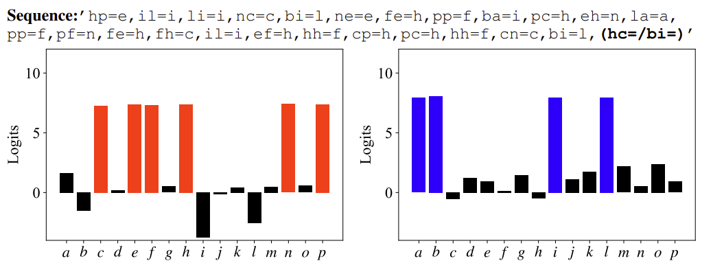 We find a single attention head is primarily responsible for copying answers from context, similar to the induction heads from (Olsson et al., 2022) or n-gram heads seen in (Akyürek et al., 2024). This head performs both verbatim copying (when an exact duplicate fact exists) and commutative copying (when a commutative pair exists, e.g., copying "ba = c" when the query is "ab ="). However, because not all products are commutative (in dihedral groups), this copying heuristic can't always solve a sequence, and additional mechanisms described below refine the prediction.