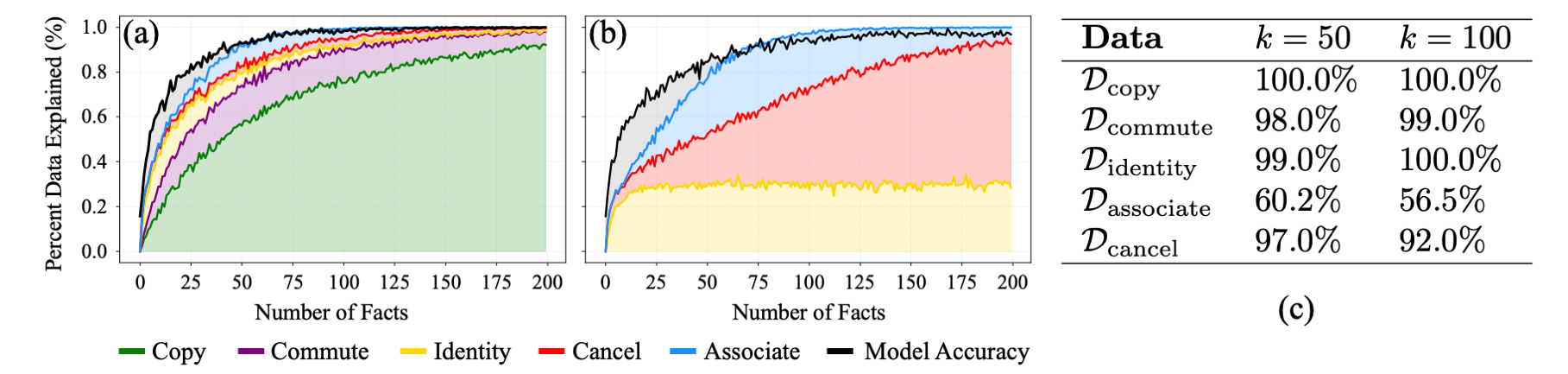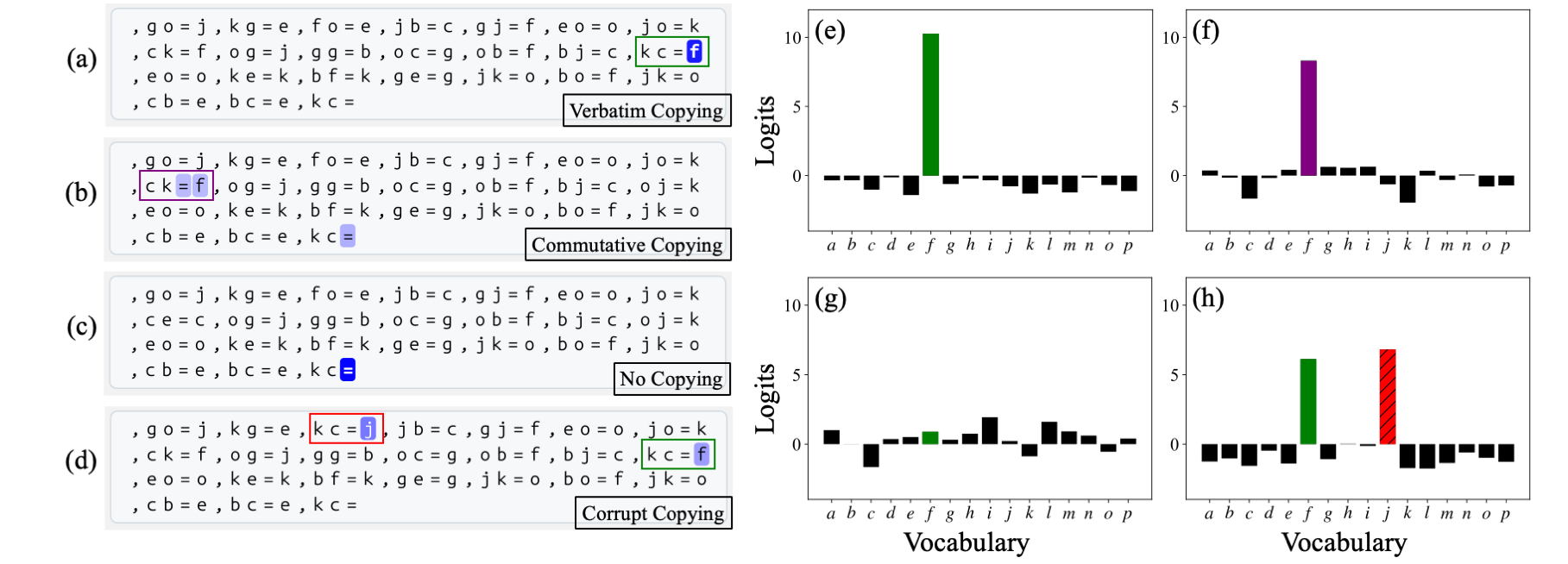 As you probably saw when trying to solve different sequences, it's possible that multiple algorithms could theoretically produce correct predictions. This can make it challenging to identify which mechanisms the model actually implements. To disambiguate between potential mechanisms, we design five targeted data distributions to test specific algorithms that can solve algebra sequences when a corresponding set of facts is present in the context: Verbatim Copying, Commutative Copying, Identity Element Recognition, Closure-Based Cancellation, and Associative Composition.