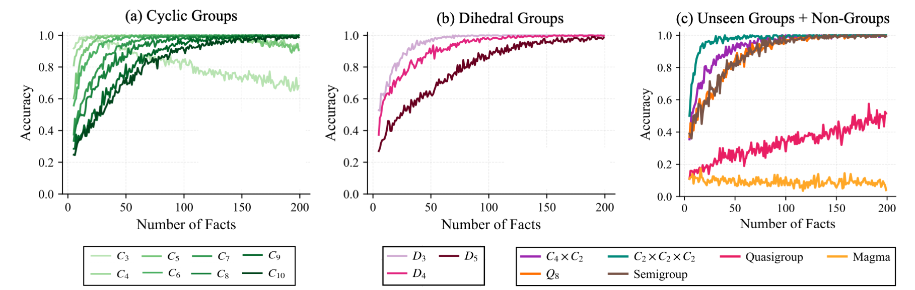 Models achieve near-perfect hold-out accuracy for in-distribution groups: (a) cyclic groups and (b) dihedral groups. In general, hold-out performance improves as more facts are given as context to the model. More surprising is the model's generalization to (c) unseen algebraic groups. Models also perform well on semigroups, but worse on quasigroups and collapse on magmas (also shown in (c)).