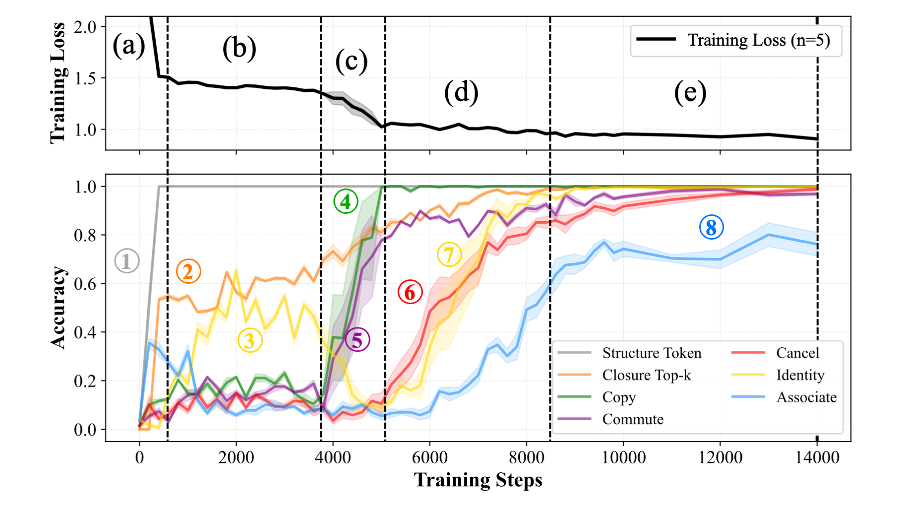 We find that models undergo a similar sequence of phase transitions during training across different seeds and configurations. Models first learn to (1) predict structural tokens, followed quickly by (2) learning to compute group closure: learning that combining two group elements always yields another valid group element. At the same time, the model learns the (3) query promotion submechanism, achieving around 50% on identity sequences. The next sharp drop in loss corresponds to the model learning (4) contextual copying, first reproducing facts verbatim and then extending to (5) commutative copying. Later mechanisms emerge more gradually. The model develops \textbf{identity recognition}, steadily improving on identity-related facts Once the model can retrieve facts from context, it quickly learns to solve both identity and cancellation facts at the same time. We hypothesize these are learned jointly because the (6) elimination subspace and the (7) identity demotion mechanism perform similar functions, and their "promotion" submechanism counterparts are learned at similar times earlier in training. Finally, models begin to solve some associative sequences, though this happ. This learning trajectory suggests that models acquire discrete skills in a particular order, building on previously learned mechanisms to learn more complex ones.