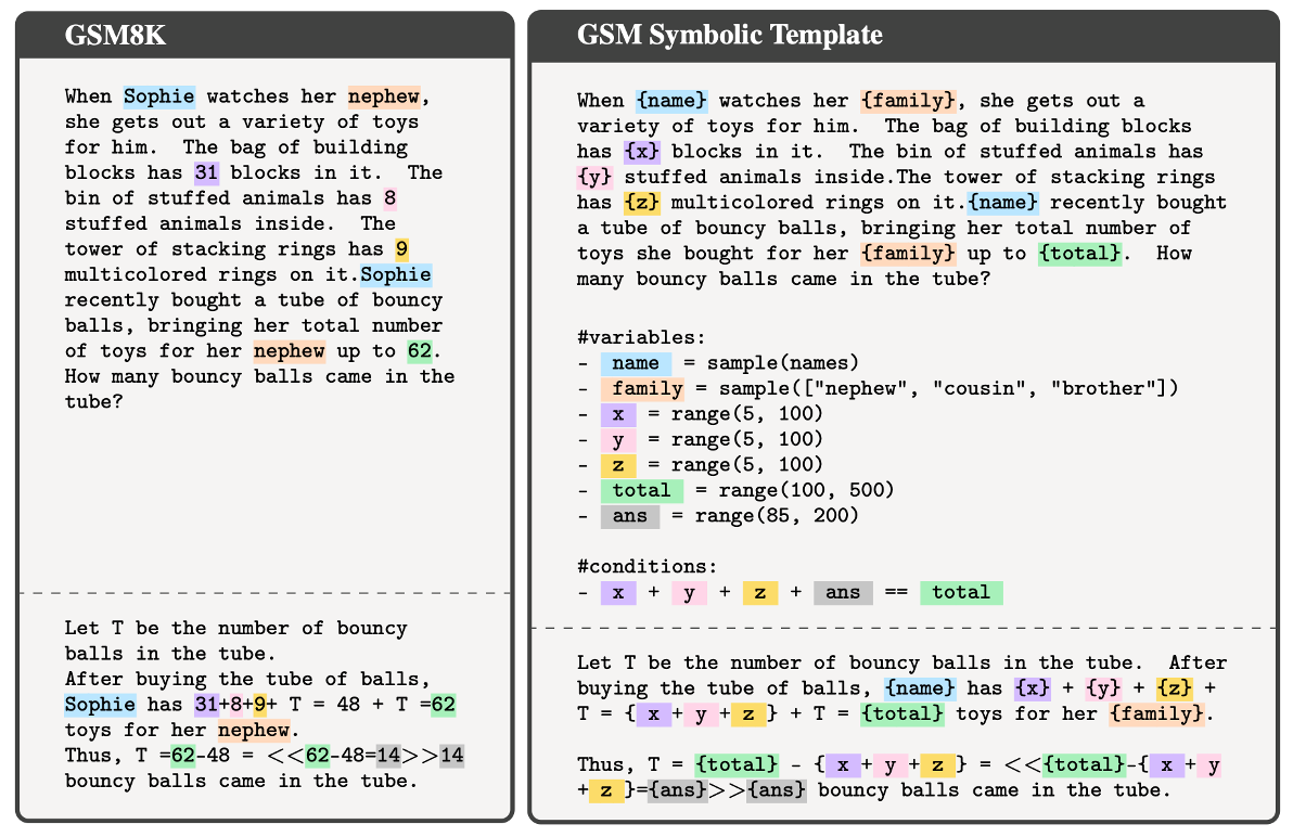 Notes: Introduces GSM-symbolic, a variant of GSM8K (Cobbe et al., 2021) that uses symbolic templates to generate a more diverse set of grade school math problems. They find LLM performance has high variance to rephrasings and lacks robustness to changes in numeric values of simple math problems.